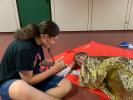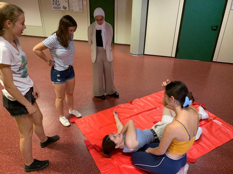 Die Schüler*innen hatten sich in den vergangenen Monaten mit Hilfe von Online-Material die theoretischen Inhalte angeeignet. Zur theoretischen Vertiefung und praktischen Übung sowie zur Fortbildung der schon ausgebildeten Schulsanitäter*innen führte das Leitungsteam aus Finn Stickler und Sophia Proksch einen ganztägigen Ausbildungstag durch. Da es ausgerechnet am Ausbildungstag gleich zwei Notfälle an der Schule gab und die Schüler*innen ihr neu erworbenen Wissen sofort anwenden mussten, wurde klar, wie schnell aus der Theorie praktischer Ernst werden kann.