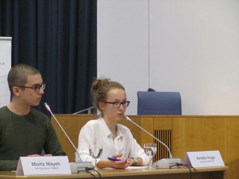 Das Thema der Finaldebatte lautete: „Sollen außerhalb von Schulabschluss und Schulwechsel Notenzeugnisse durch Berichtszeugnisse ersetzt werden?“ Amelie vertrat gemeinsam mit einem Schüler des Kant-Gymnasiums Boppard die PRO-Seite und musste sich auf der CONTRA-Seite mit zwei Schülern des Görres-Gymnasiums Koblenz und der IGS Goetheschule Kaiserslautern auseinandersetzen. Während den anderen Finalteilnehmern die Nervosität zum Teil deutlich anzumerken war, debattierte Amelie auf der großen Bühne des Mainzer Landtags unter Beobachtung von Presse und Politprominenz (u.a. Landtagspräsident Hendrik Hering) unheimlich souverän und abgeklärt. Die Jury lobte besonders ihr bemerkenswertes Ausdrucksvermögen und honorierte, dass sie die Debatte durch neue Aspekte immer wieder vorangebracht habe. Der verdiente Lohn für diese hervorragende Leistung war der zweite Platz im Landesfinale und der damit verbundene Einzug in den Bundeswettbewerb von „Jugend debattiert“, der am 21. und 22. Juni in Berlin stattfindet. Als Preis erhält Amelie zusätzlich ein fünftägiges Rhetorikseminar, das sie gemeinsam mit den Siegerinnen und Siegern der anderen Länder auf den Bundeswettbewerb vorbereitet.