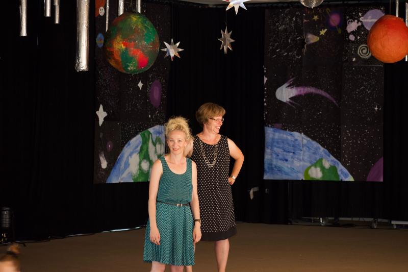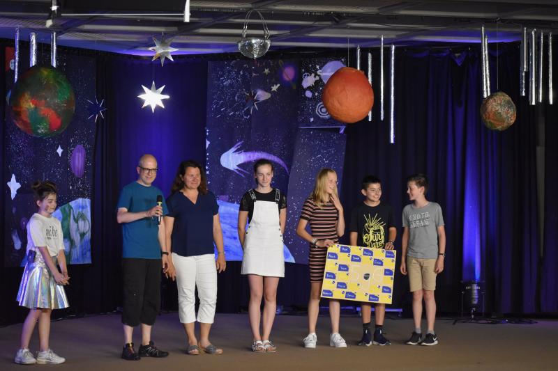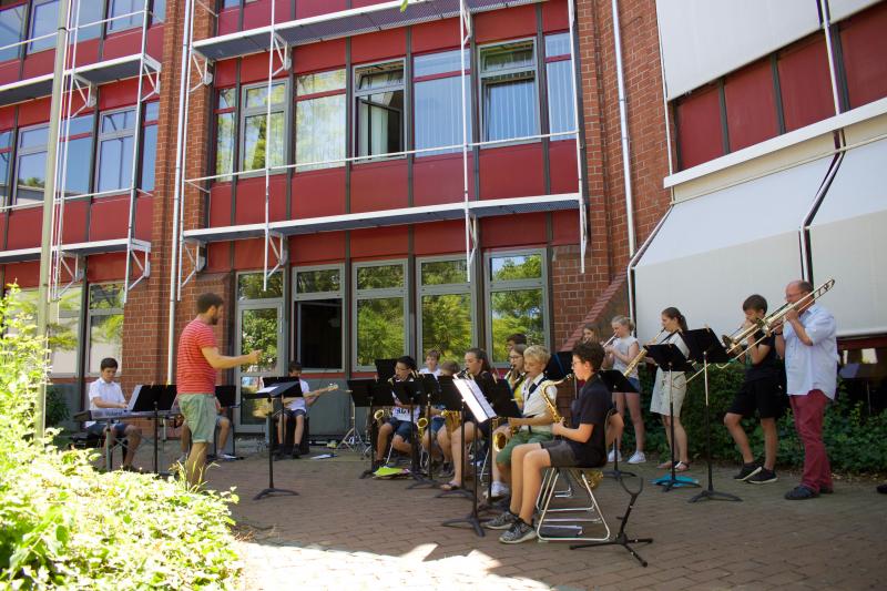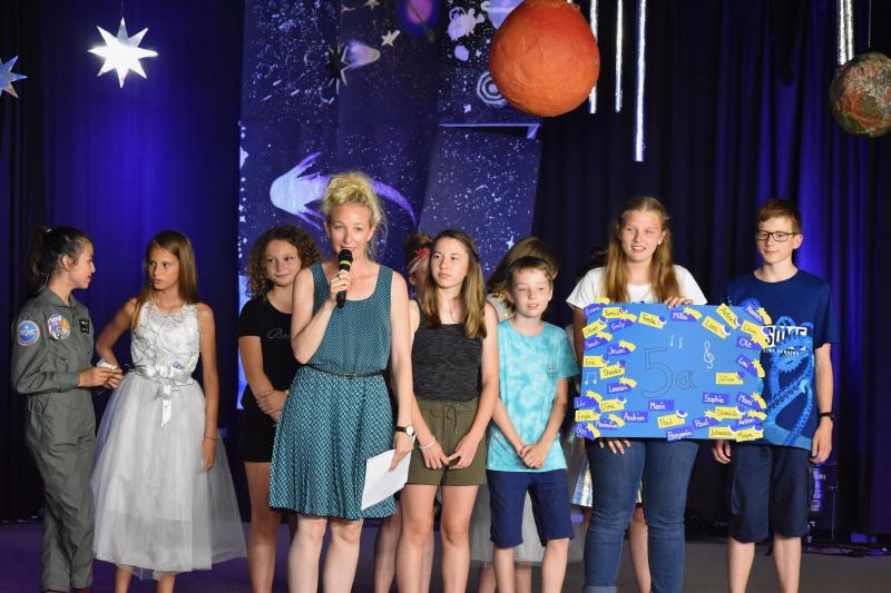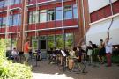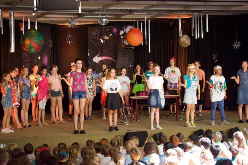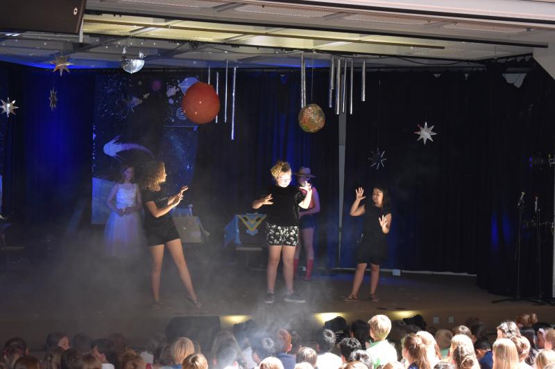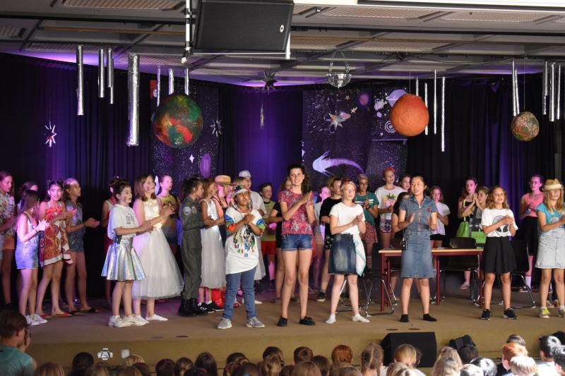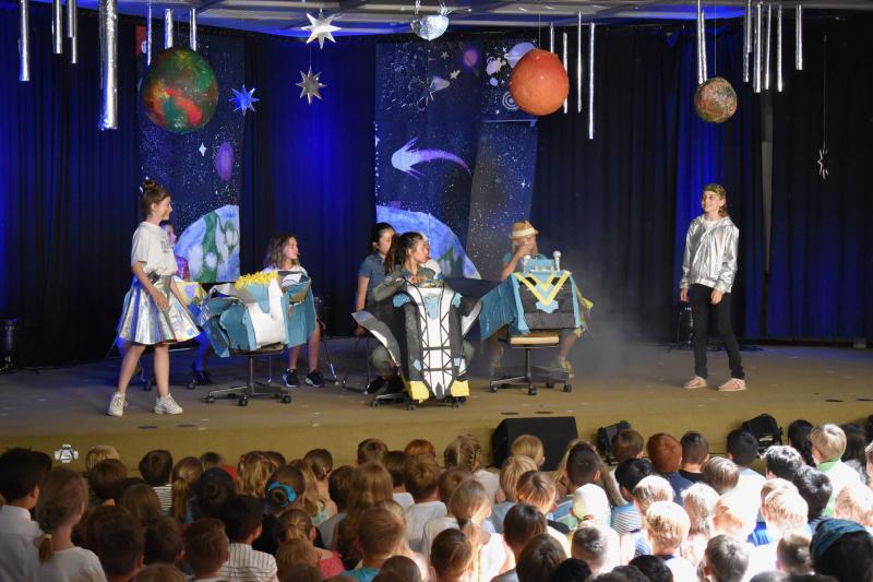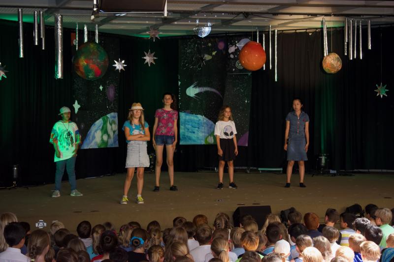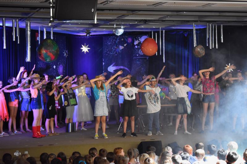 Die Aufnahmefeier für die Schülerinnen und Schüler der neuen 5. Klassen fand am letzten Donnerstag vor den Ferien im Foyer von Haus A statt. Die zukünftigen Fünftklässler wurden bereits draußen von der Nachwuchs-Big Band musikalisch begrüßt. Auch im Foyer ging es musikalisch weiter. Schülerinnen und Schüler der Ganztags-AG „Musical“ führten das Stück „Ufo – Kein Wunsch ist schnuppe“ auf.