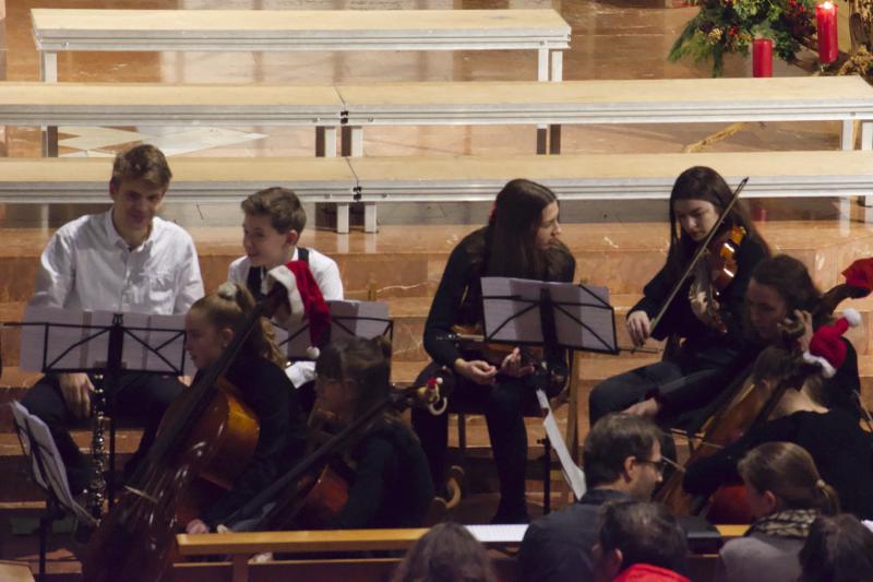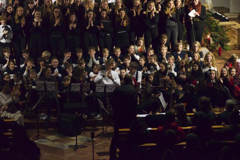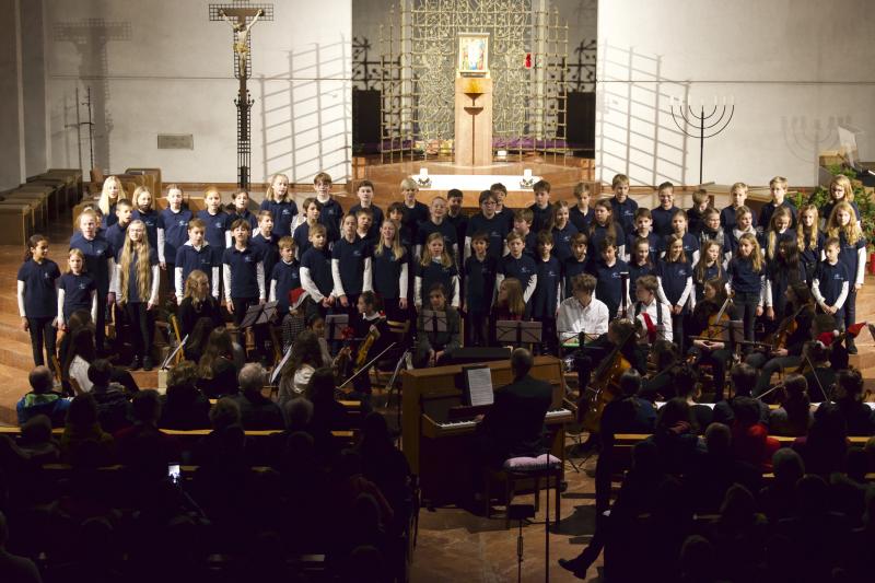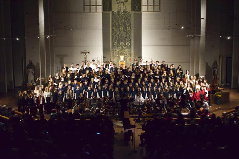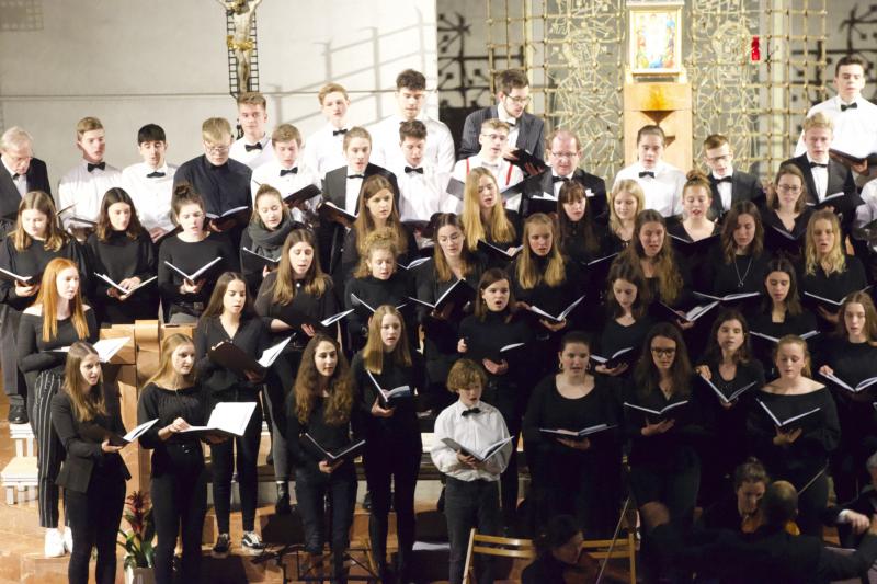 Den Altarraum füllten alle Chor- und Orchester-Ensembles des Gymnasiums: Die Gesangsklassen (6a und 6b donnertags/5a, 5b und Mittelstufenchor freitags), der Kammerchor, der Oberstufenchor, das Olag*-Ensemble (Lehrer-Orchester plus special guests), das Orchester und einige ehemalige Schülerinnen und Schüler sowie Lehrer.