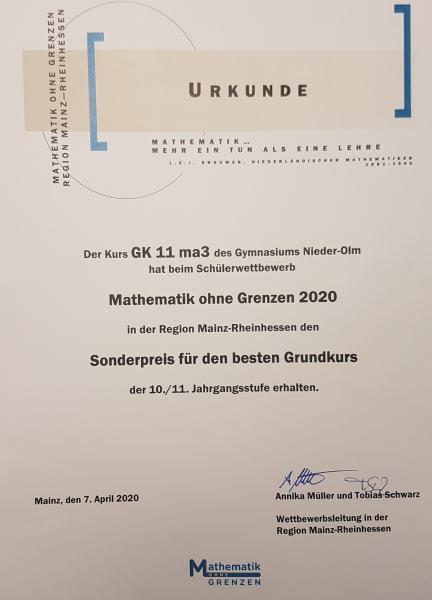 Beim internationalen Wettbewerb „Mathematik ohne Grenzen“ für 10. und 11. Jahrgangsstufen gewann der Grundkurs 11ma3 den Sonderpreis als bester Grundkurs in der Region Mainz-Rheinhessen. Hier nahmen in diesem Jahr 71 Klassen bzw. Kurse teil.