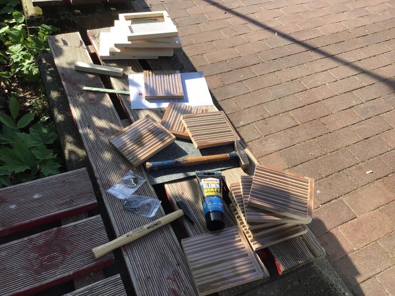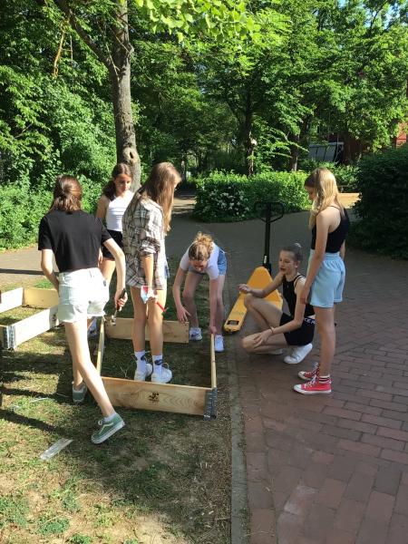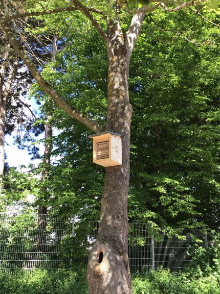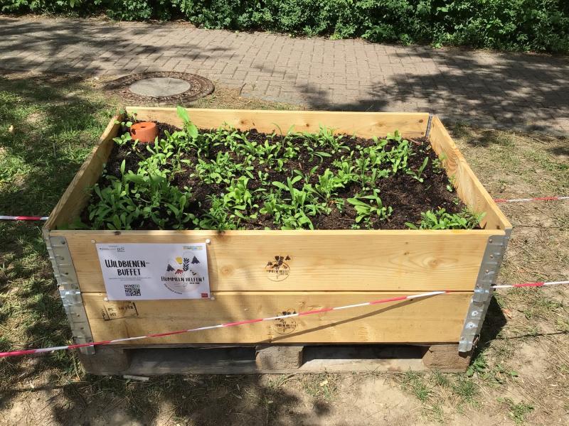 „Höchste Zeit noch mehr zu tun!“, dachten wir uns und starteten gleich mehrere Aktionen, um das Schulgelände noch bienenfreundlicher zu gestalten und die Öffentlichkeit zu informieren: das Anlegen eines Hochbeetes mit einer Mischung heimischer Blütenpflanzen als Nahrungsquelle für Wildbienen, den Bau einer Nisthilfe sowie einer Bienentränke, das Verteilen von Aktionspostkarten für Blühstreifen, das Herstellen von Saatpapier zum Verteilen und die Gestaltung einer Ausstellung.