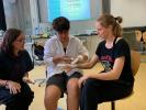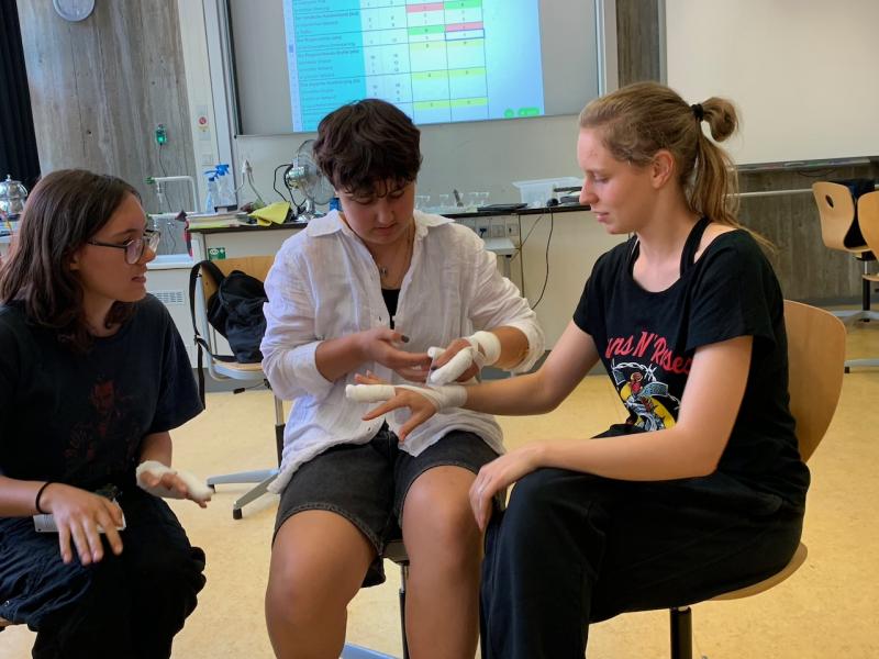 Die äußerst kreative Planung der Stationen verlangte von uns zum Beispiel, dass ein Fingerverband in Staffelarbeit angelegt werden sollte, bei dem es am Ende um die korrekte Technik und die Schnelligkeit ging. Und ob das noch nicht schon genug wäre, mussten wir mit Verband auch noch unser Geschick im Werfen unter Beweis stellen. Eine weitere Station forderte unsere Ausdauer und Schnelligkeit heraus. Dabei ging es darum mit unserer Materialtasche möglichst schnell eine gewisse Strecke zurückzulegen und am Ende einen niedrigeren Puls zu haben.
