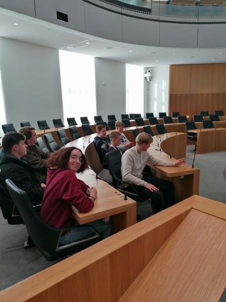 Nach dieser ausführlichen Runde durch Mainz hatten wir erstmal Mittagspause um uns zu stärken und uns auf die Landtagsabgeordneten vorzubereiten. Uns wurde im Voraus bereits mitgeteilt, welche Abgeordneten zum Gespräch kommen würden, weshalb wir gezielt Fragen an die jeweilige Fraktion stellen konnten. Eine Stunde später standen wir dann vor dem Landtag, wo wir von unserem Tourguide Moritz empfangen wurden. Nachdem alle durch die Sicherheitskontrolle gegangen waren, wurden wir durch das Gebäude geführt. Der Landtag wurde erst vor Kurzem kernsaniert und renoviert, was man an der modernen Einrichtung deutlich erkennen konnte. Allerdings wurden trotzdem einige Teile vom ursprünglichen Landtag erhalten, wie z.B. die Säulen im Untergeschoss oder Teile der Mauer. Schließlich standen wir dann vor dem Plenarsaal. Davor gibt es eine Art Lounge, wo sich die Abgeordneten aufhalten können, wenn sie z.B. gerade keine Rede halten. Normalerweise ist die Tür zur Lounge für Besucher geschlossen, sodass man nur von außen hereinschauen kann. Dann ging es endlich in den Saal. Hier durften wir uns überall hinsetzen, sogar auf den Präsidentensitz. Während Moritz uns alles über den Saal erzählte, kamen nach und nach die Abgeordneten herein. Moritz beendete seinen Vortrag und sowohl wir als auch die Abgeordneten stellten sich kurz vor. Zu unserer Überraschung war jemand von der AfD-Fraktion da. Kurz darauf begann unser Fragenhagel: Wir waren kritisch und fordernd in unseren Aussagen, denn schließlich haben wir nicht umsonst Leistungskurs Sozialkunde. Es wurden hitzige Diskussionen geführt und wir erlebten Politik hautnah - mit uns in der Hauptrolle! Unter anderem wurden Aussagen getätigt wie „[…] der Verfassungsschutz sollte abgeschafft werden!“ (AfD-Fraktion), was natürlich für reichlich Aufruhr sorgte. Nach einer sehr spannenden, aber leider viel zu kurzen Stunde endete unsere Gesprächsrunde. Der Kurs war sich allerdings einig: Wir hätten noch ewig weiterdiskutieren können!