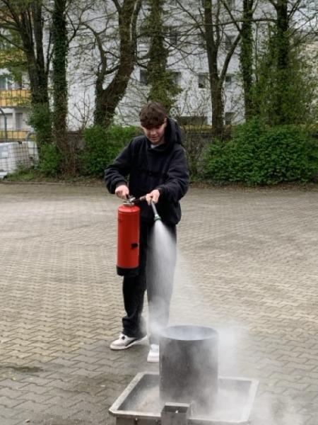 Dort wurden der Klasse die Tätigkeiten der freiwilligen Feuerwehr, die Inneneinrichtung eines Einsatzwagens und das Löschen mit dem Feuerlöscher näher gebracht. Außerdem wurde durch ein kontrolliertes Feuer ein Ölbrand simuliert und davon zahlreich Fotos und Videos gemacht.