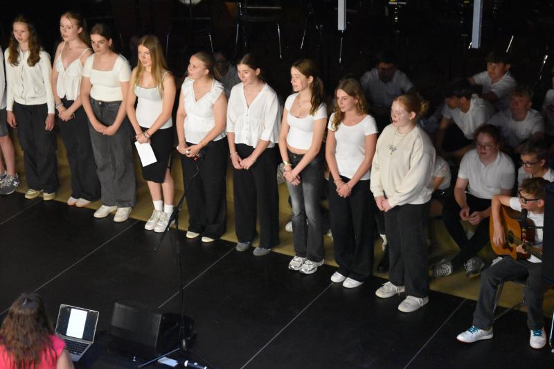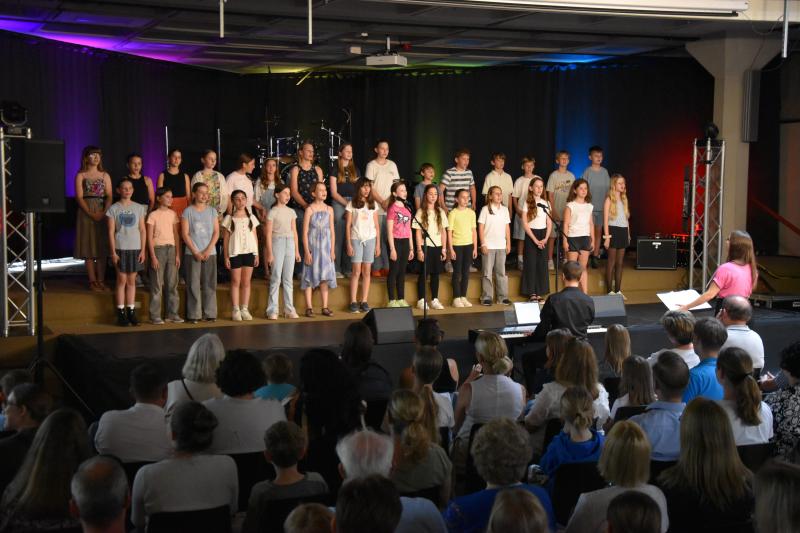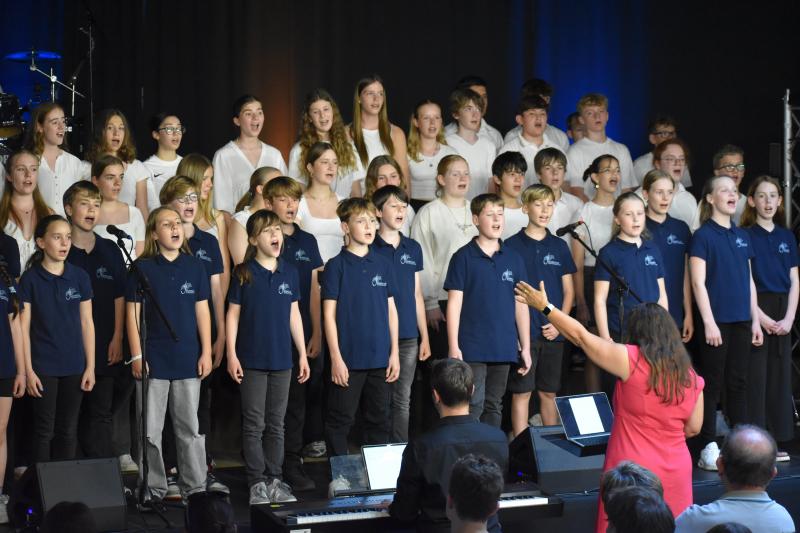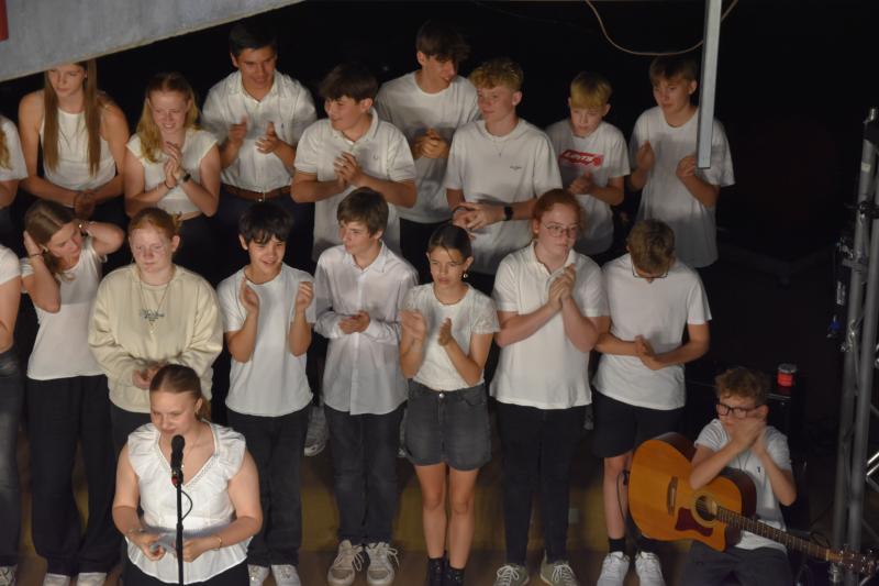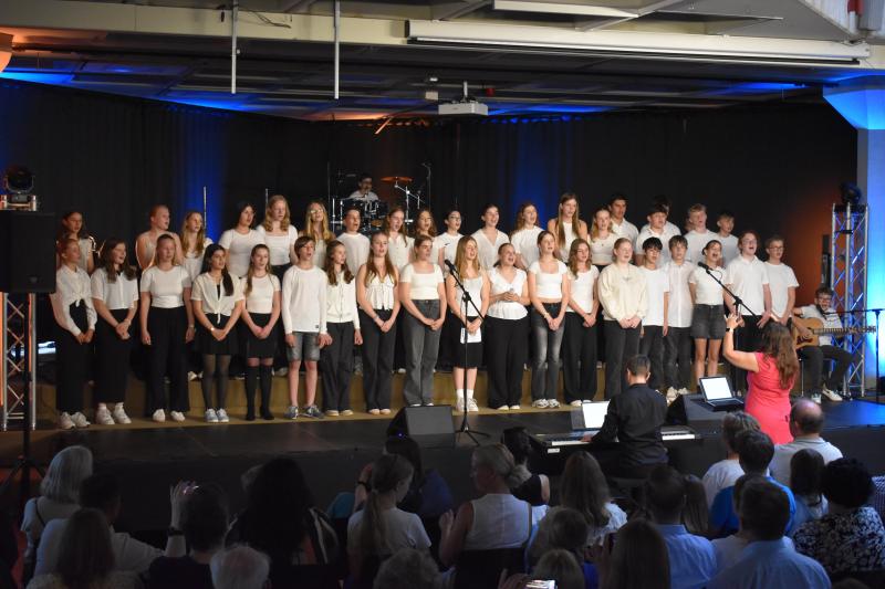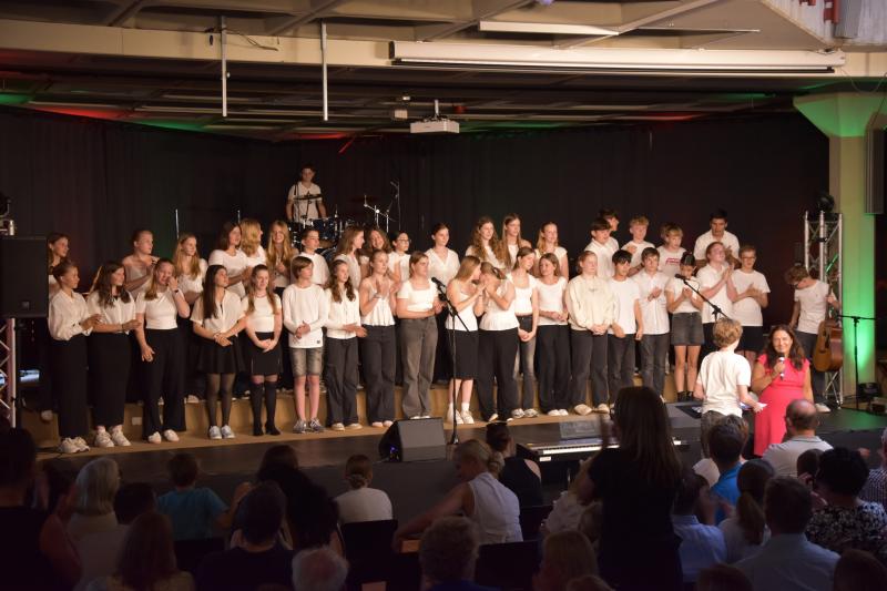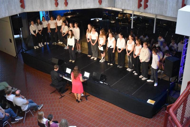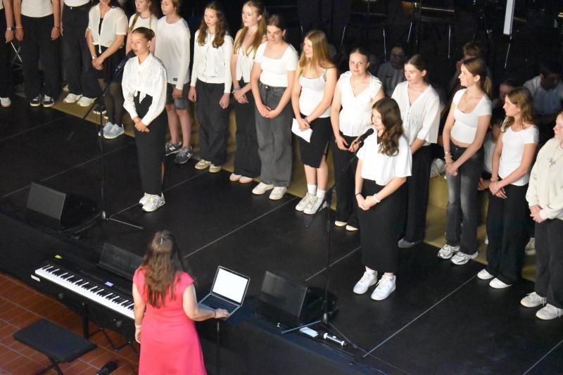 Den Abschluss gestaltete der Mittelstufenchor unter der Leitung von Frau Ibata, begleitet von Herrn Janson am Klavier sowie den Schülern Johann am Schlagzeug, Max an der Gitarre und Valentin am Klavier. Die drei Instrumentalisten überzeugten mit sicherem Rhythmusgefühl und feinem Gespür fürs Zusammenspiel. Der Chor selbst beeindruckte durch Klangtiefe, Präzision und Ausdrucksstärke – Stück für Stück wuchs hier eine musikalische Spannung, die den ganzen Raum füllte und den Abend eindrucksvoll abrundete.