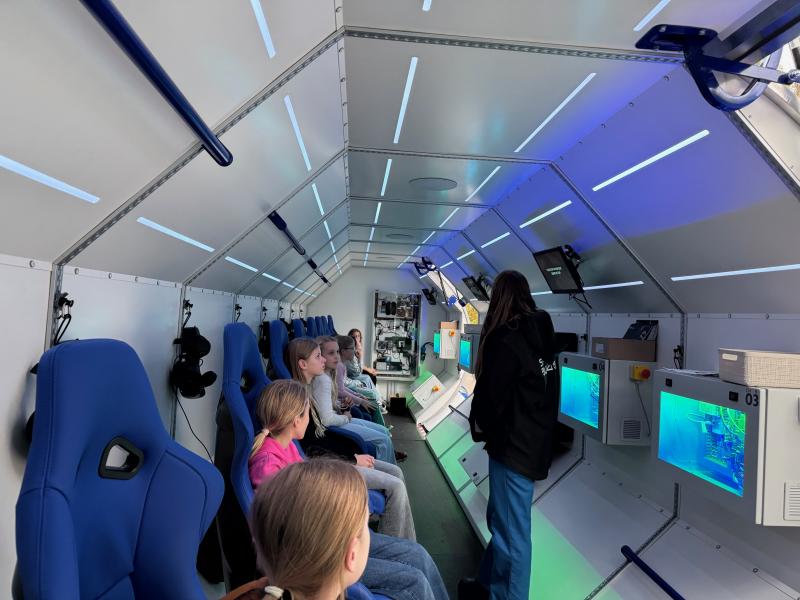 Der Spacebuzz One, ein LKW mit Anhänger in Raketenform der Deutschen Raumfahrtagentur, wartete auf dem Parkplatz hinter der Turnhalle auf die Schülerinnen und Schüler. Nach einer kurzen Einweisung wurden alle mit VR-Brillen ausgestattet und konnten gemeinsam mit den beiden deutschen Astronauten Alexander Gerst und Matthias Maurer einen unvergesslichen virtuellen Flug in den Weltraum unternehmen. Dabei lernte man viel über unseren schönen Heimatplaneten und dass wir ihn schützen müssen. Danach wurde kurz auch der Mond besucht und zum Schluss der Reise sind wieder alle sicher auf der Erde gelandet.