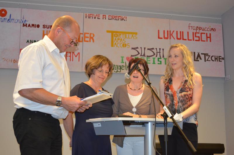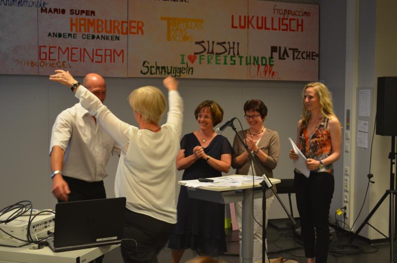Auch wenn ein bisschen Wehmut im Spiel war - es war ein fröhliches Fest, bei dem am Mittwochabend der letzten Schulwoche vor den Ferien die Verabschiedung von drei Menschen gefeiert wurde, die das Gymnasium Nieder-Olm sehr geprägt haben: StD' Renate Birkmeyer, OStR' Birgit Stecker und StD Joseph Zeimentz.