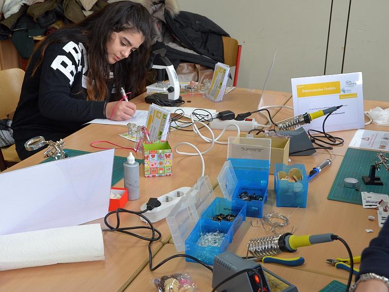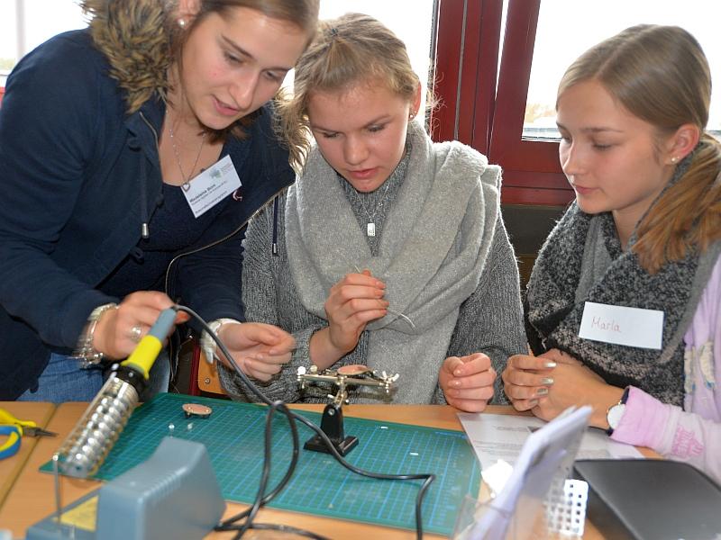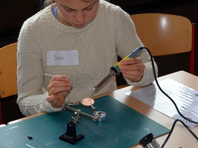 Bei der Station Mikrosystemtechnik gab es zwei Aufgaben zu bewältigen: das Untersuchen und Bestücken einer Platine und das Verbinden der Platine und den Bauteilen für eine LED, wofür wir die Bestandteile löten mussten. Das erforderte eine ruhige Hand und viel Geschick, doch durch die gute Hilfe der Workshopleiterinnen funktionierte das Löten bei allen Teilnehmern sofort.