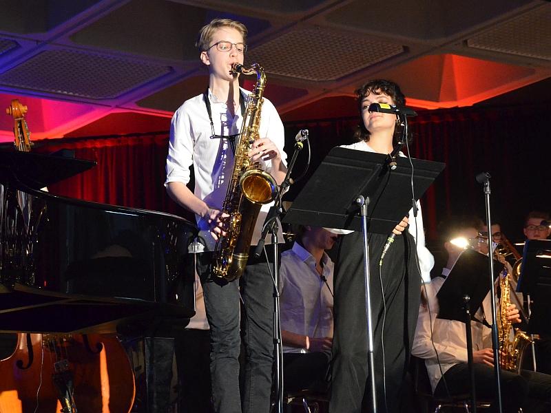 Eine „leistungsstarke Darbietung“ hatte Marcel Rudszeck für das Jahreskonzert der Gymno Big-Band versprochen. Nicht zu wenig, denn die Rhythmen wurden im Verlauf des Abends immer grooviger und der Sound immer voller. Vor allem die virtuosen Soloeinlagen von Henry Schappert (Saxofon) und Johann Prinz (Trompete) sowie die starke Stimme der neuen Sängerin Charlotte Koch schafften glanzvolle Höhepunkte und zeigten, wie vielseitig die aktuelle Big Band ist. Ihr Repertoire reicht von Rock über Funk und Swing bis hin zu Balladen. Neben Marcel Rudszeck übernahmen auch Wolfgang Rieger und der Musik-Allround-Schüler Moritz Holdenried das Dirigat.